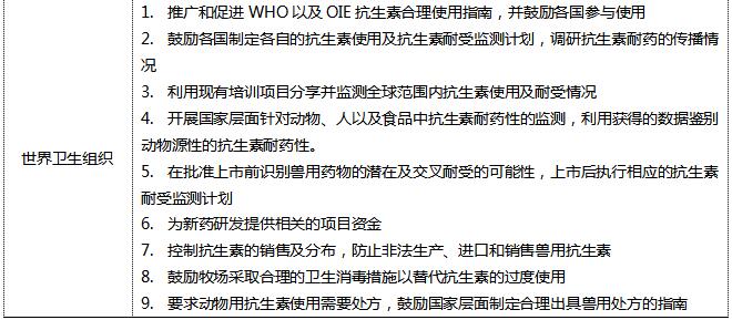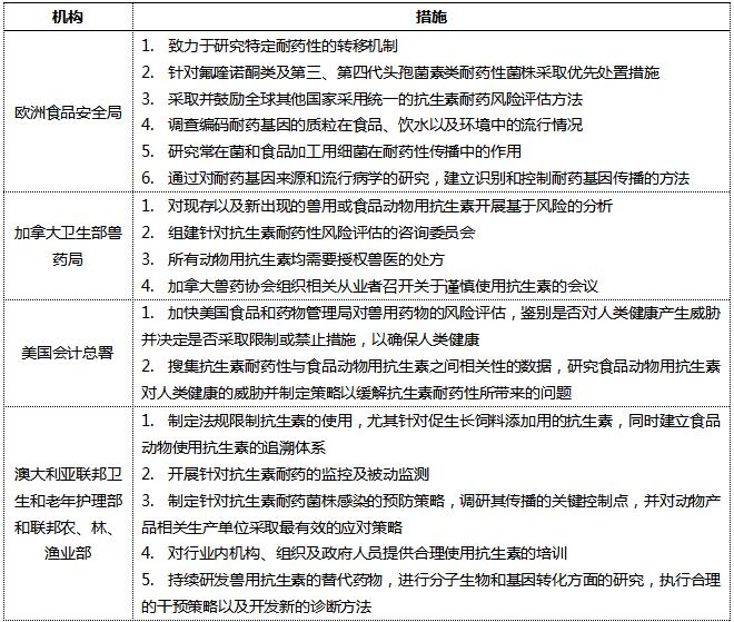 鉴于抗生素耐药性对公共卫生健康的影响,国际社会对抗生素使用均采取较为保守的态度,尽量避免抗生素的过度使用,尤其是在食品动物中的过度使用,并且都采取了相应的应对策略和措施,以防止或减缓出现新的耐药性,并且阻止耐药性的传播。表1列出了部分国家及国际组织目前对使用抗生素的态度和措施。