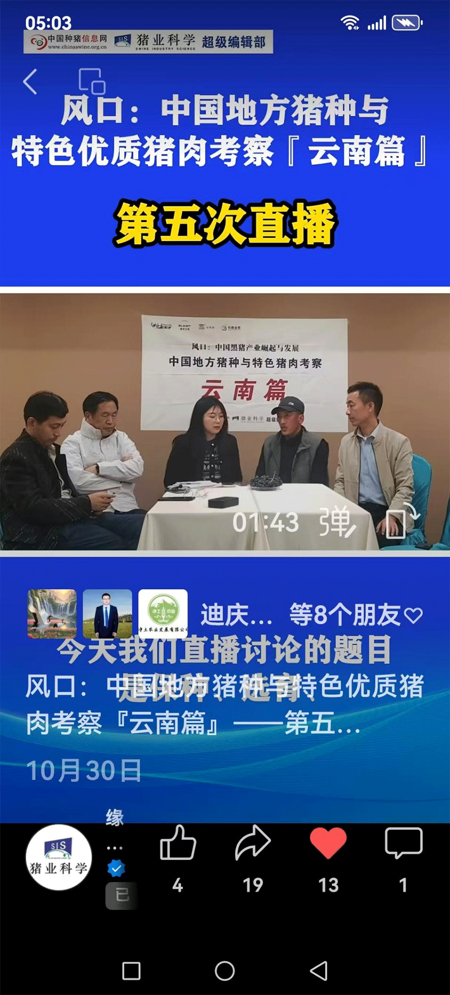 2025年10月21日,中国种猪信息网&《猪业科学》超级编辑部,在河南恒银自动化科技有限公司、洛阳普泰生物技术有限公司、广东诸阁靓农业科技有限公司和云南玖鼎金猪科技有限公司支持下,考察团一行13人,在云南农业大学赵桂英教授组织、协调下开启【中国地方猪种及特色优质猪肉考察】活动。