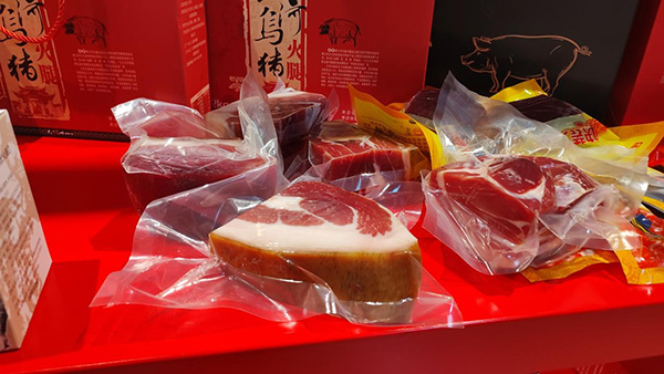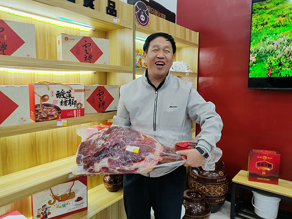 第二天,8:30 准时出发。第一站来到大河乌猪体验店,里面有鲜猪肉和一些加工制品,我高兴地拿起一条火腿拍照。 |