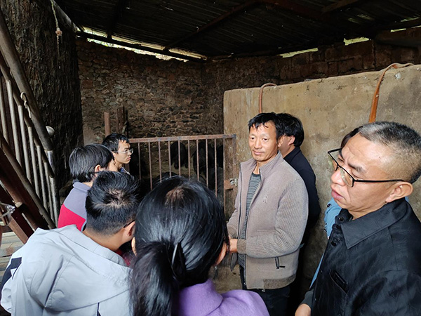 | 第五站,我们走饭饲养大河猪农户。一个乡镇防疫员负责几个农户猪的防疫,和国外专职兽医一样,她负责猪只注射疫苗和兽医防疫工作,我们也终于见到大河乌猪了。 |
